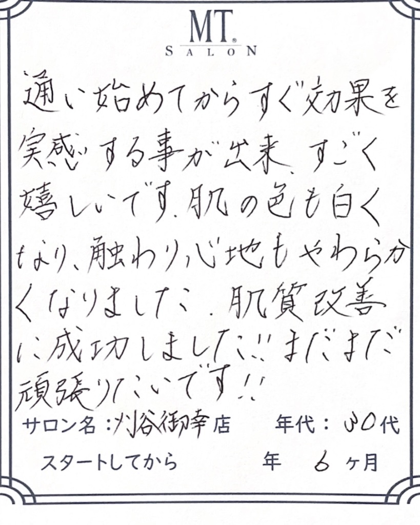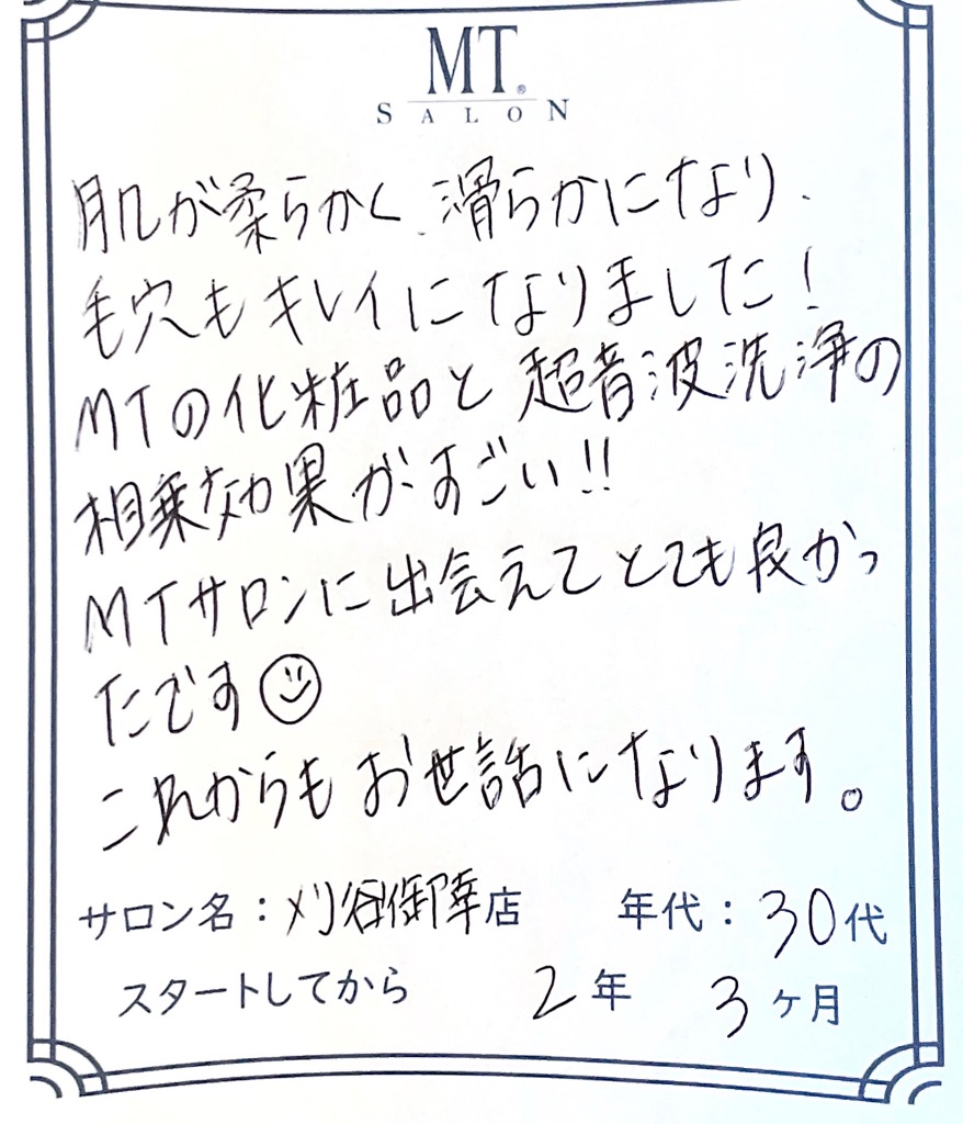 MTサロンについて More お客様の声 30代後半の女性 超音波洗浄+ビタミンC導入後の肌 30代後半の女性 超音波洗浄+ビタミンC導入後の肌 毛穴の黒ずみ・開きに効果的!超音波洗浄をした後にビタミンCで導入し、毛穴を引き締めていきます。 30代後半の女性 スタート後6ヶ月 30代後半の女性 スタート後6ヶ月 通い始めてからすぐ効果を実感することが出来、すごく嬉しいです。肌の色も白くなり、さわり心地も柔らかくなりました。肌質改善に成功しました!!まだまだ頑張りたいです!! 30代前半の女性 スタート後2年3ヶ月 30代前半の女性 スタート後2年3ヶ月 肌が柔らかく、なめらかになり、毛穴もキレイになりました!MTの化粧品と超音波洗浄の相乗効果がすごい!!MTサロンに出会えてとても良かったです♪これからもお世話になります。 More 商品紹介ページ More メニュー More